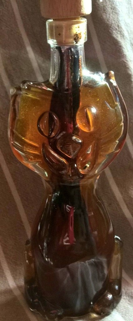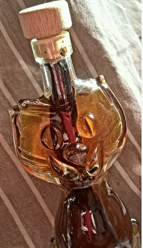 5/ vous pouvez ensuite au fil du temps ( pour ma part 4 ans Apres ) transférer dans de jolies bouteille ,par exemple une Bouteille chat votre extrait de vanille maison .