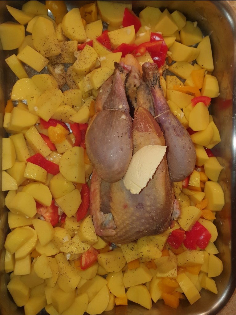 6/Salez et poivrez le tout puis mettez le beurre đ§ sur la pintade.