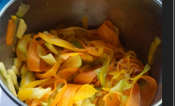 3/ Dans un cul de poule :  faire des tagliatelles de légumes avec les courgettes et les carottes à l’aide de votre économe .