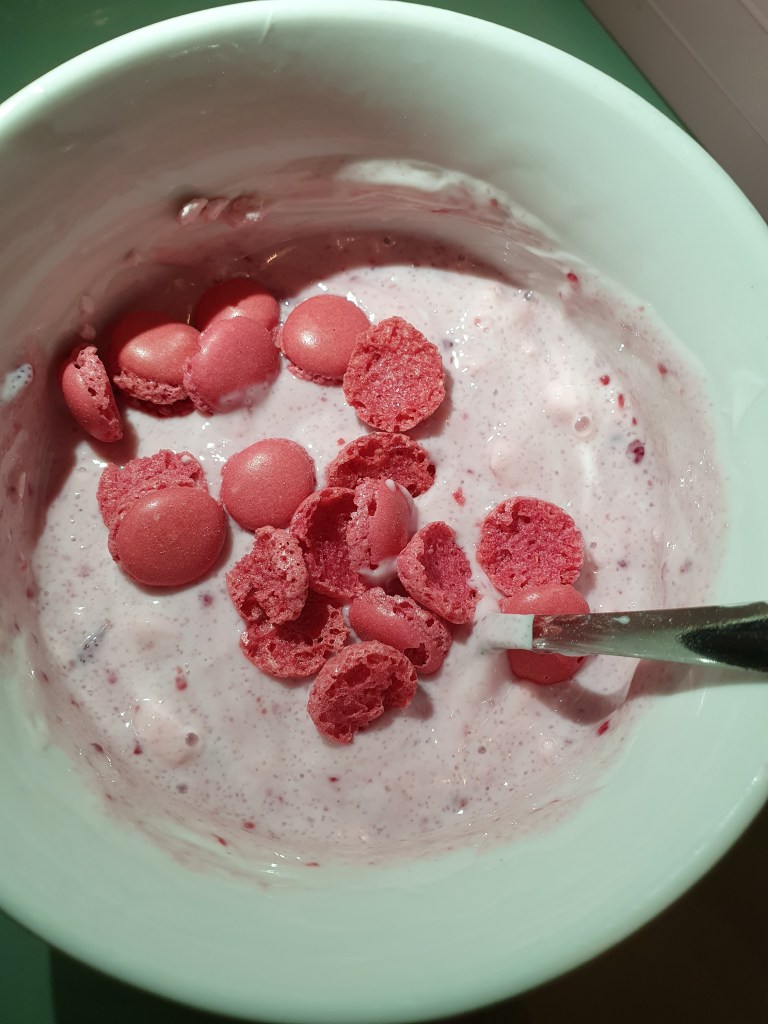 2/ Ajoutez les perles de macarons de framboisesau dessus de votre mĂ©lange et degustez đ