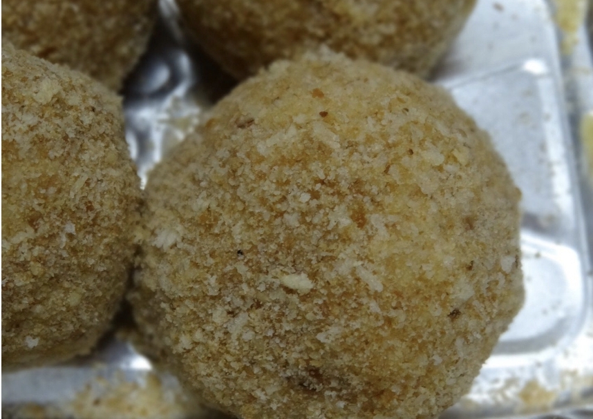 11/Roulez les boulettes dans un bain de farine ( secouez l’excédent ), roulez les dans le bain d’oeufs battus ( environ 20 gr ),puis roulez les dans un 3 eme bain de chapelure .