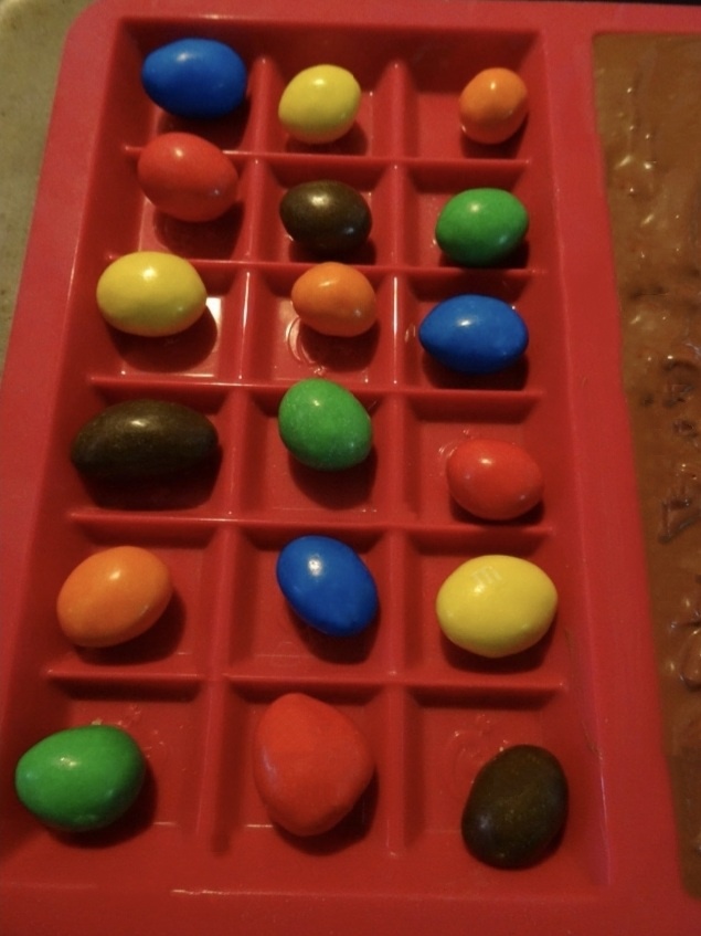 3/ Posez 1 M&M’S dans chaque carré du moule à tablette à chocolat .