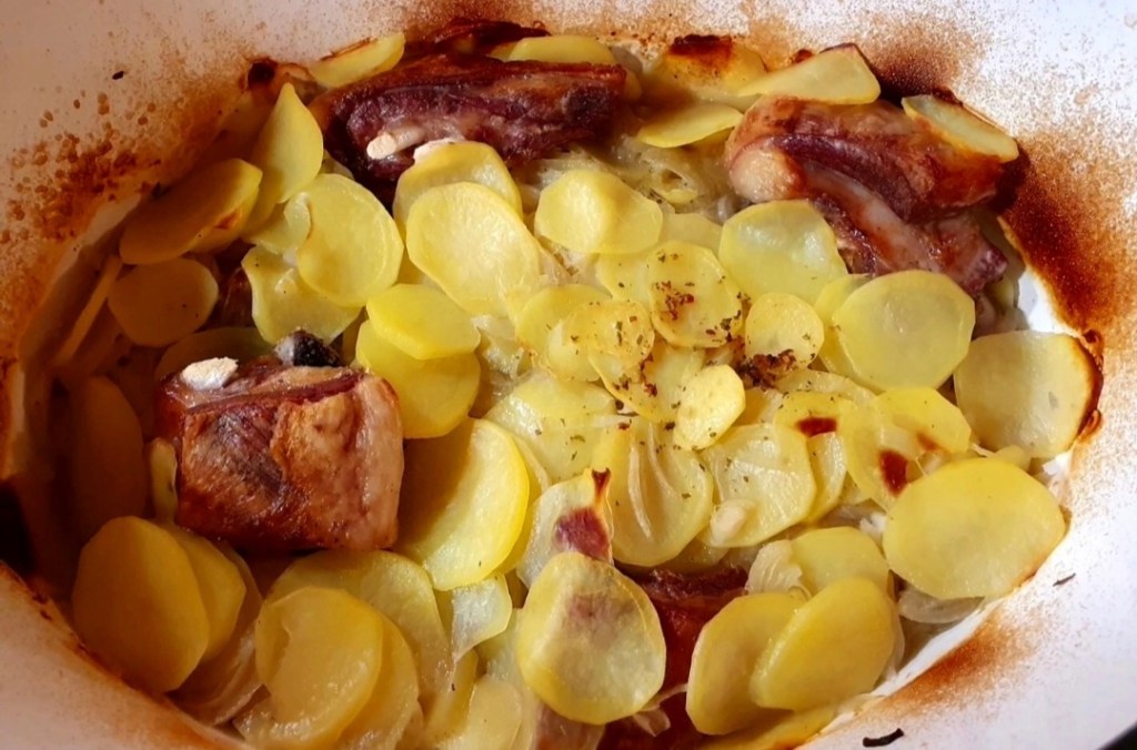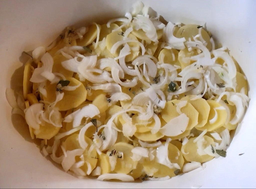8/ Ajoutez une couche de viande puis recommencez une couche de pomme de terre 🥔, une couche d’oignons émincés 🧅,un peu de mélange ail/thym/laurier ,sel,poivre et viande ….terminez par une couche de pomme de terre 🥔.