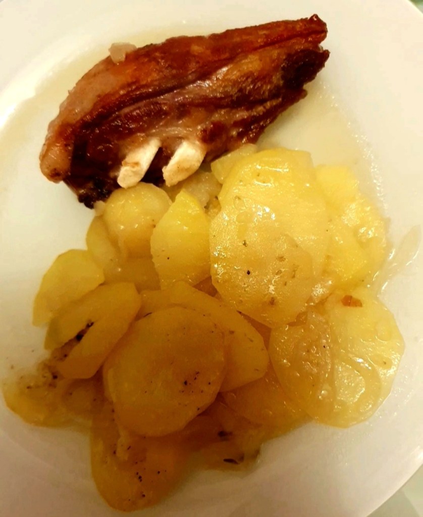 - Mettez une 1 ere couche de pomme de terre essuyé dans la cocotte, parsemez y d’un peu de mélange ail/thym/laurier ,salez et poivrez .
