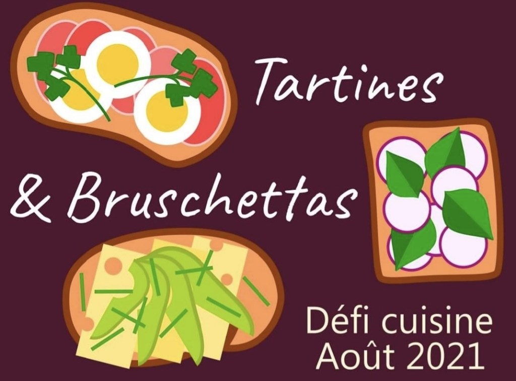 Le thème du défi cuisine d’août est tartines et bruschettas. C’est une invitation à expérimenter plein de tartines aux légumes et fruits d’été, à les agrémenter de milles façons, à préparer des tartines à emporter en picnic, ou à faire griller des bruschettas au four ou pourquoi pas au barbecue !
