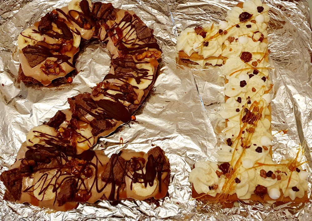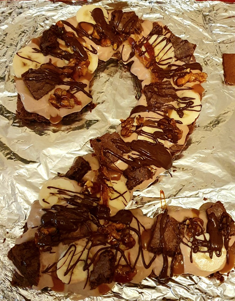 J’ai décidé de faire le chiffre  » 2  » avec une base de brownies au chocolat 🍫 noir et noix , décoré ensuite avec une crème diplomate au Gjianduja, des noix caramélisées, du caramel beurre salé, des tranches de banane 🍌 et un peu de chocolat fondu.
