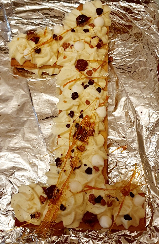 Le chiffre « 1  » est composé de 2 biscuits pâte sucrée à la noisette , d’une crème diplomate très vanillée, de caramel beurre salée, de noisettes caramélisées ,quelques filaments de caramel,des decos divers .