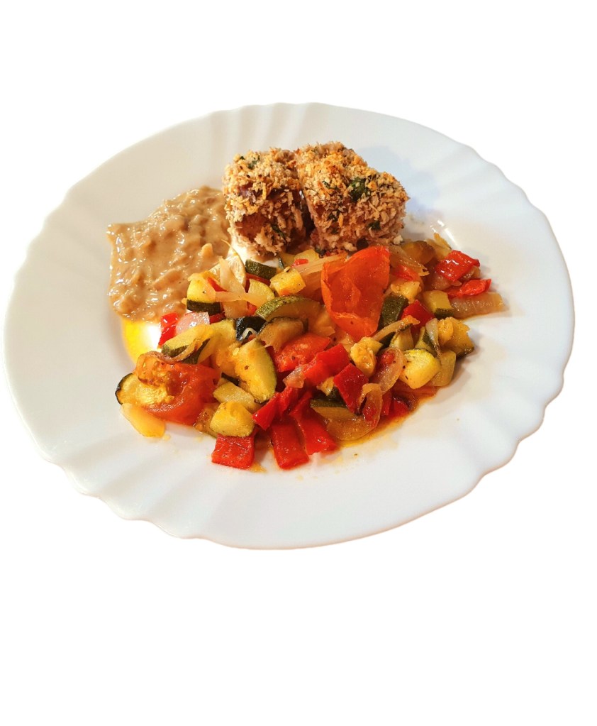 je vous propose une recette de Filet mignon de porc en croûte de moutarde et herbes avec des légumes d’été rôtis