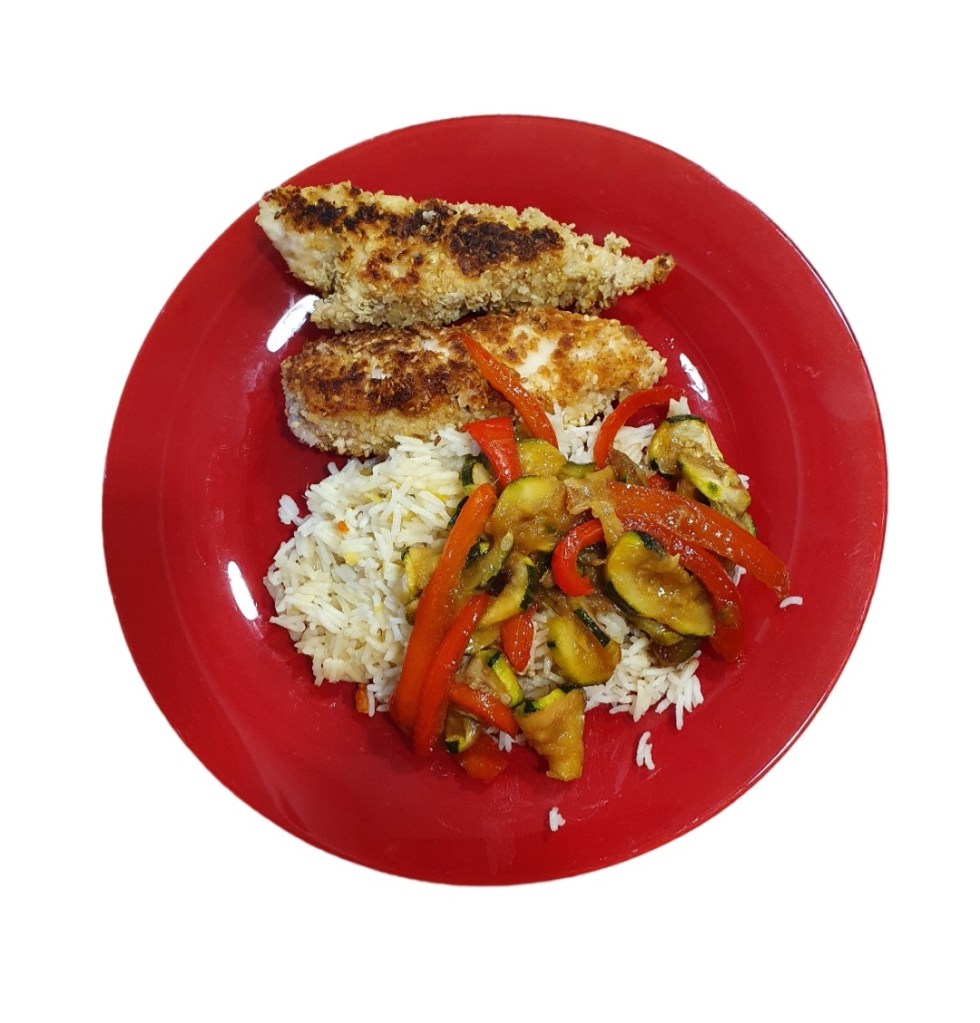 14/Servez dans une assiette le riz , des légumes rôties et quelques lanières de poulet .