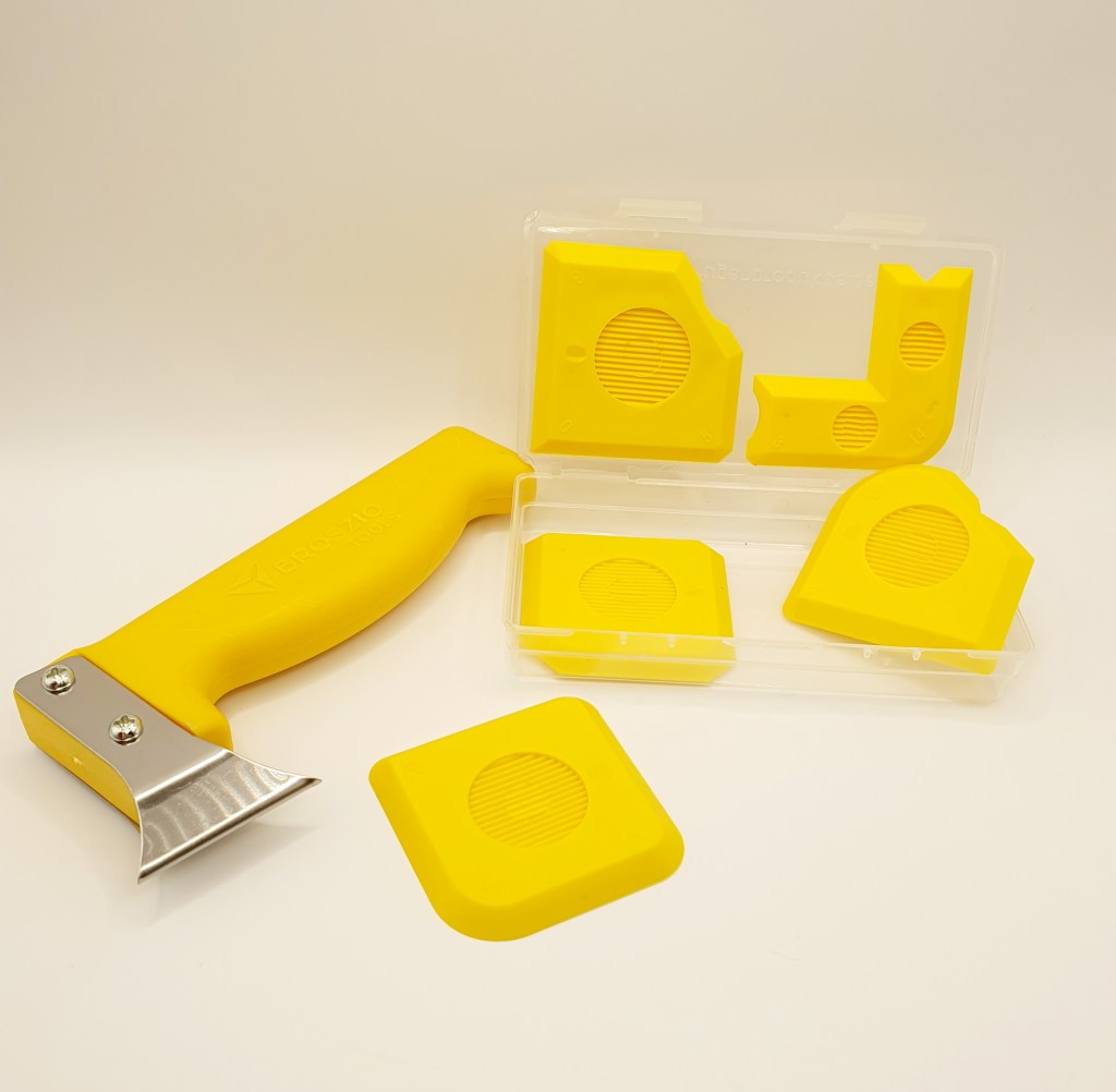 Contenant 5 grandes spatules maniables, pratiques et précises pour joints en silicone ou acrylique, le kit FACIL JOINTS se fera l’allié de vos salles de bain, fenêtres et aquariums !