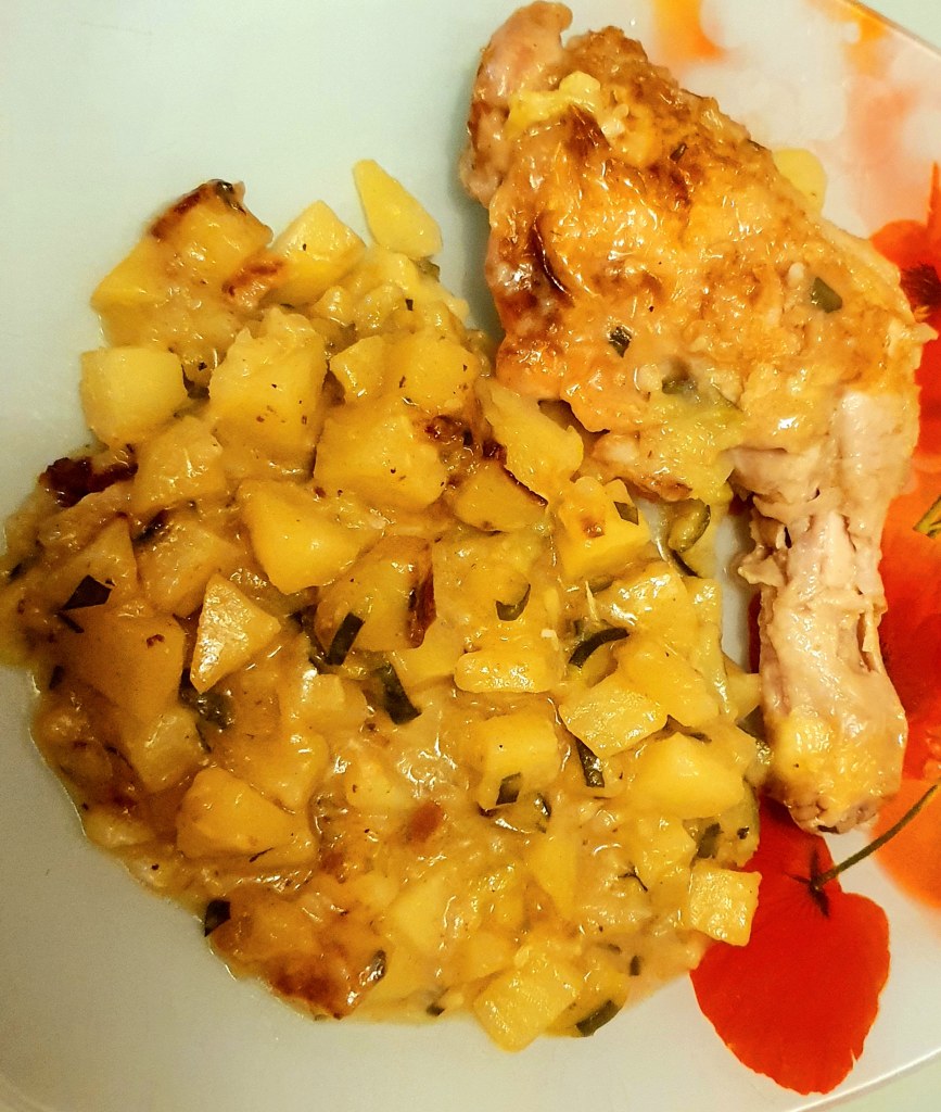 Cuisse de poulet à l’estragon, aux pommes de terre et courgette .