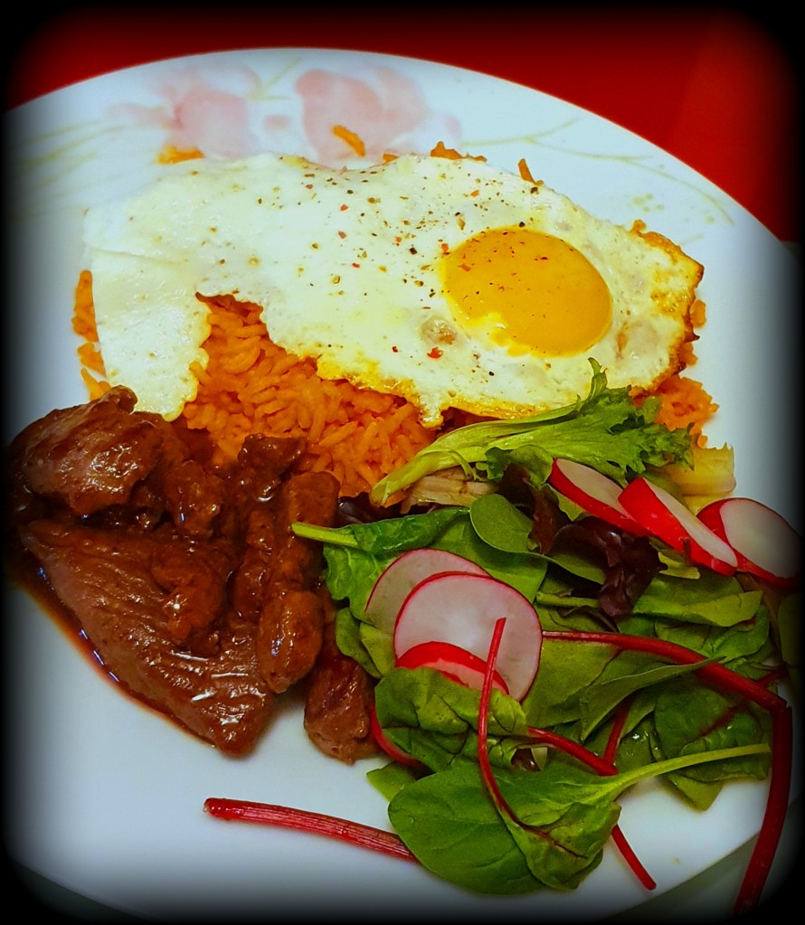 8/ Vous n’avez plus qu’à servir dans des assiettes creuses : la viande ,le riz à la tomate, la salade et enfin l’œuf au plat dessus ( voir photo )